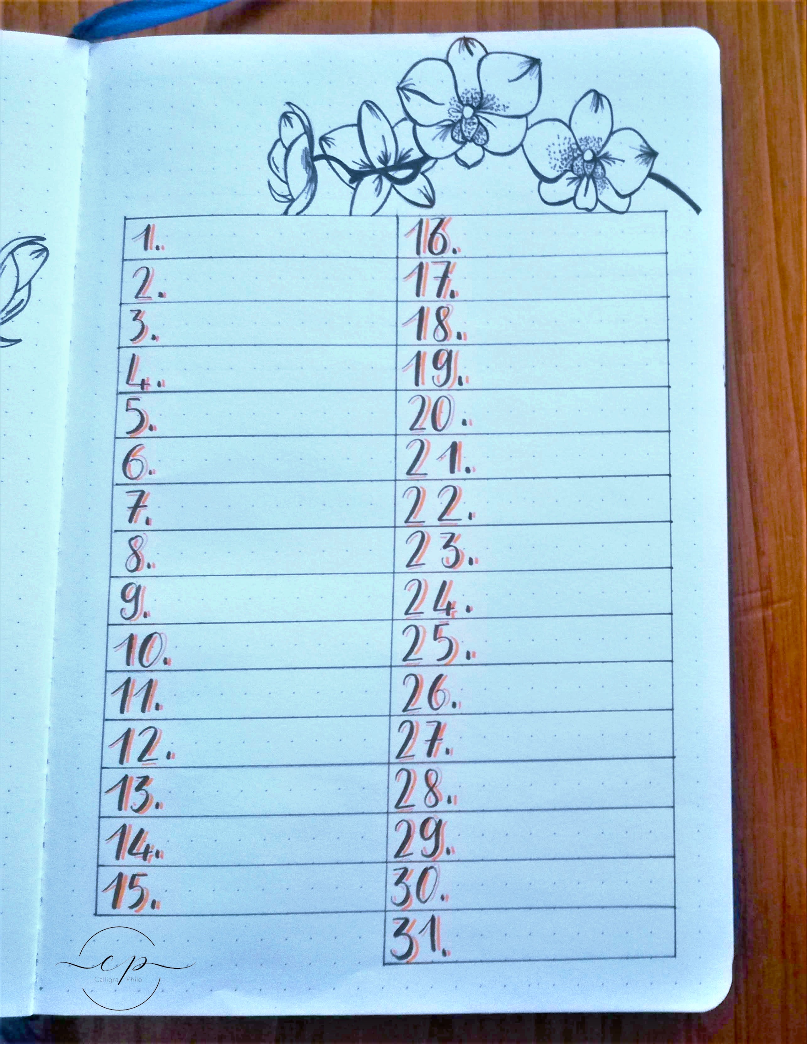 Accanto alla copertina del nuovo mese, o comunque nella pagina successiva, creo sempre un calendario mensile (Monthly Log), per avere subito una panoramica mensile completa.