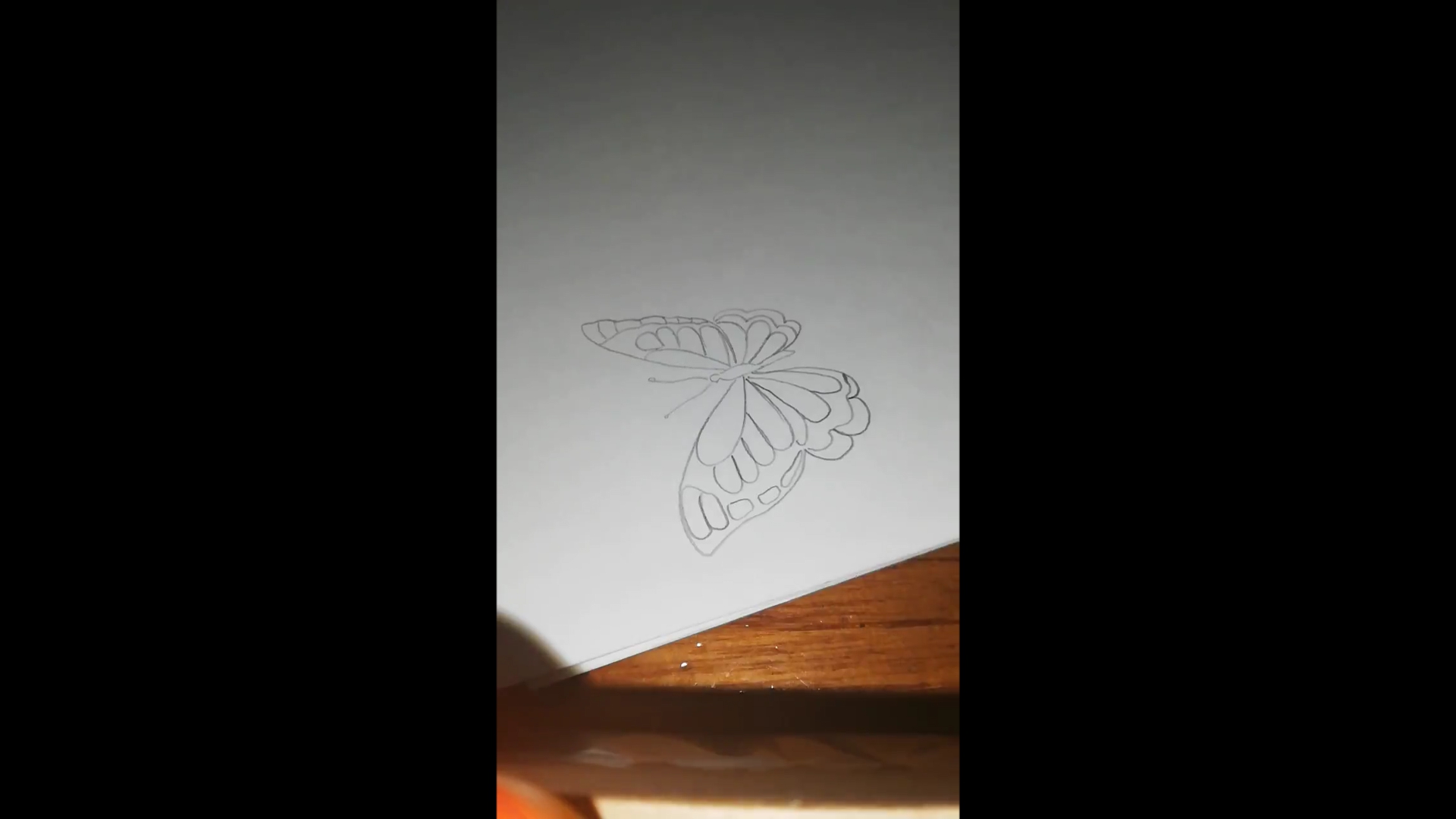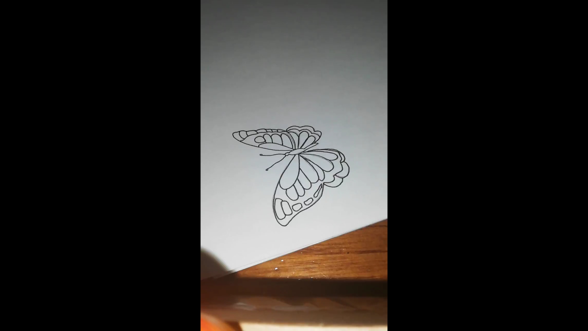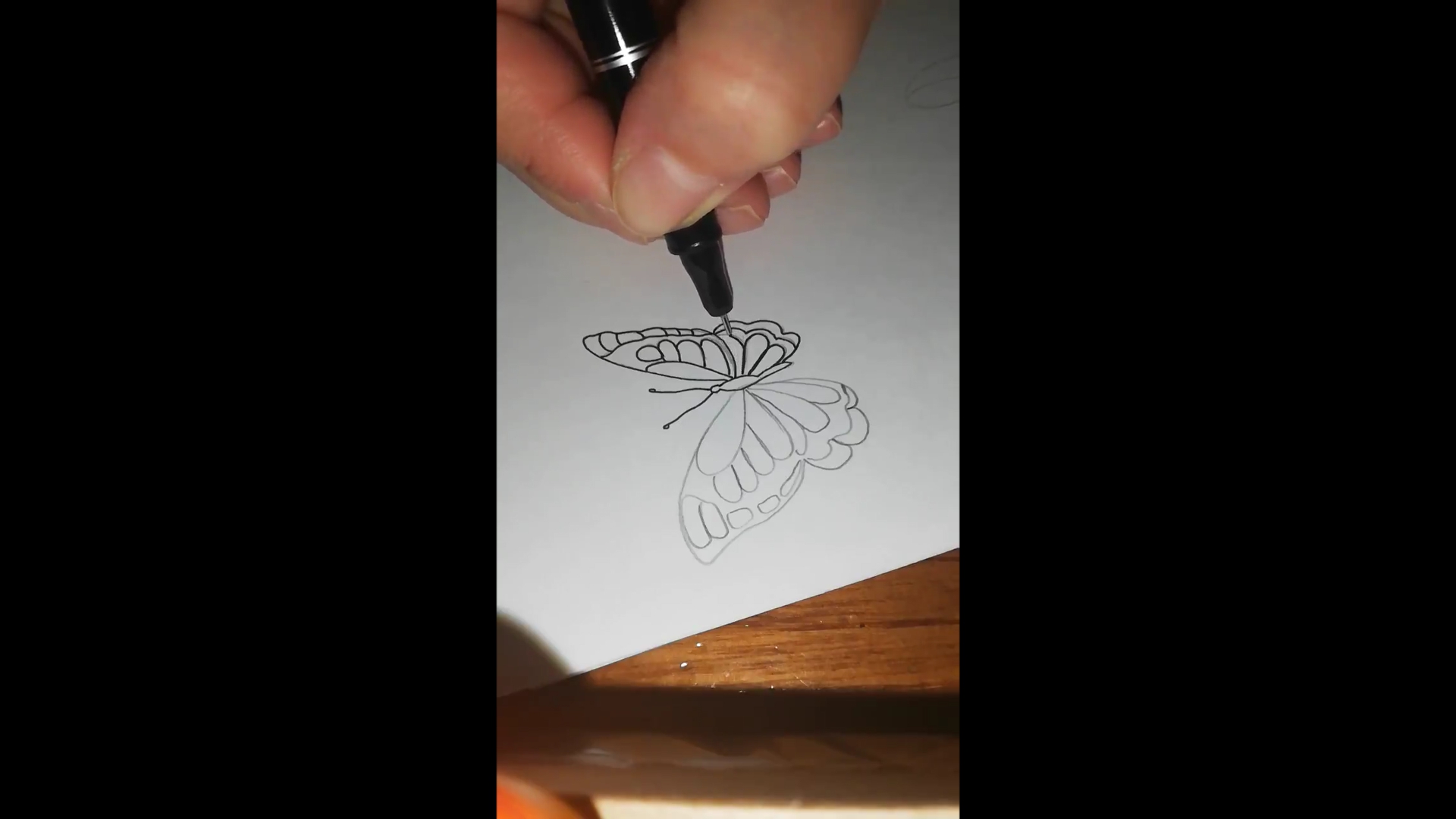 Ho iniziato dal disegno della farfalla. L’ho innanzitutto disegnata a matita, dopo di che ho ricalcato i bordi con una penna nera apunta fine.